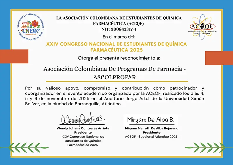 Durante los días 4, 5 y 6 de noviembre, ASCOLPROFAR participo activamente en el XXIV Congreso Nacional de Estudiantes de Química Farmacéutica (CNEQF), un evento académico que reúne a futuros profesionales de todo el país para fortalecer la formación, la investigación y el compromiso con la salud.